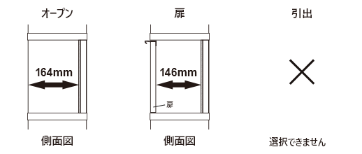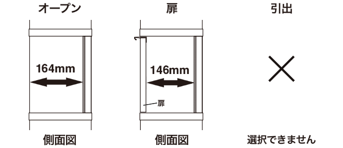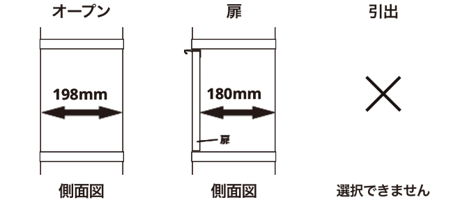 扉収納・引出収納・オープン収納の3つの収納形式の中から各ボックスごとに選択できます。※列の高さ、設置位置、奥行によっては扉と引出が選択できない場合があります。